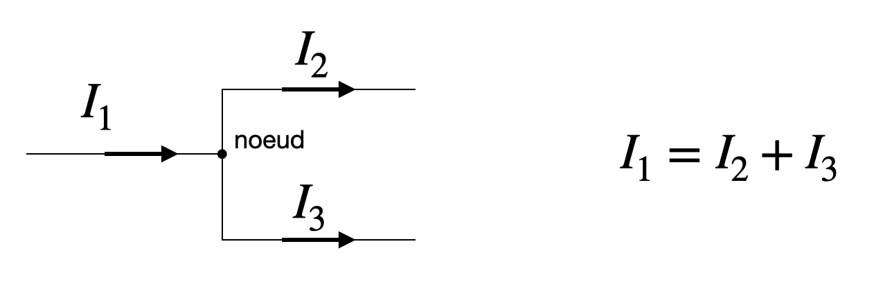 Par continuité du courant, lorsqu'il y a un noeud dans le circuit, la somme algébrique des courants qui entrent est égale à la somme des courants qui sortent.