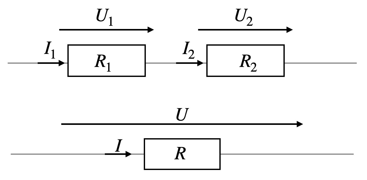Dans un circuit, on peut montrer grâce à la loi d'Ohm que l'on peut remplacer des résistances en série par une unique résistance \(R\) telle que